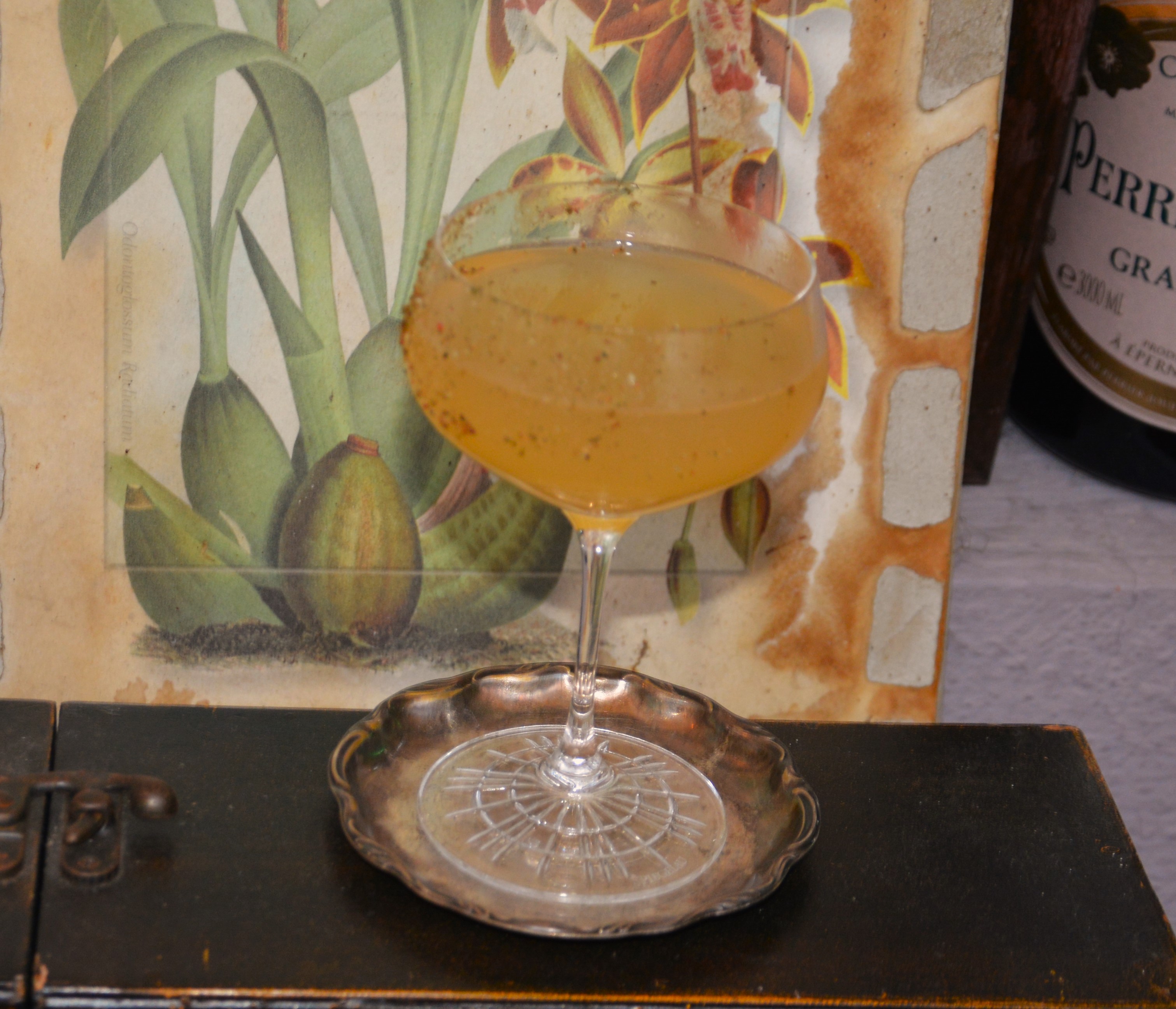 bester Ferrand Cognac zusammen mit Dry Curacao, Maraschino, frischem Zitronensaft und Black Cherry Bitters, sowie Lanson Black Label Champagner und einem Himalaya-Salz-Coating